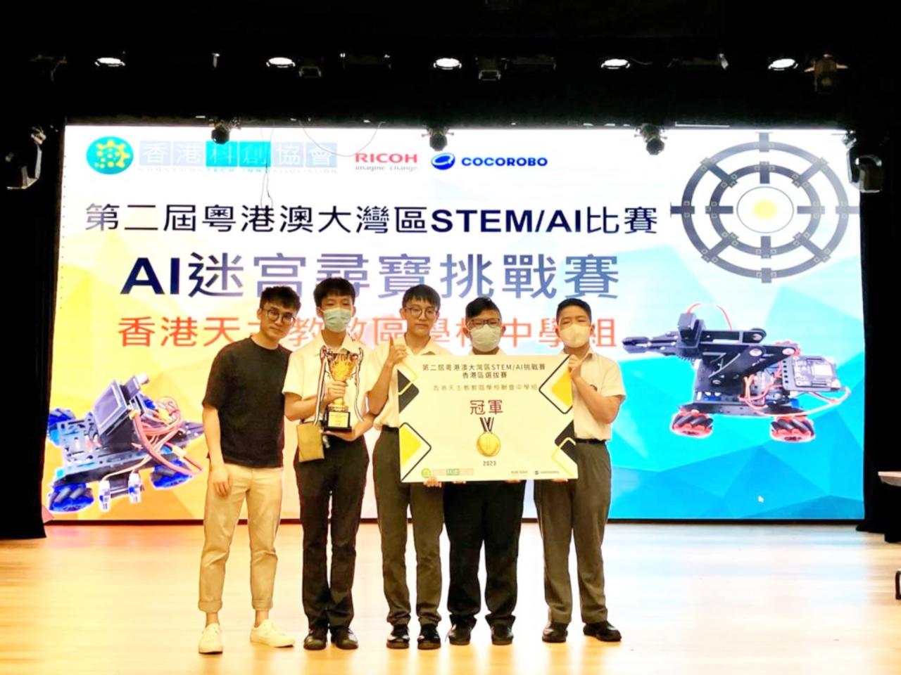2A 陳卓朗、2A鄒梓諾、3A雷耀翔、3A謝沛熹、4A鄧浩言於2023年7月8日參加了第二屆粵港澳大灣區STEM/AI挑戰賽香港區選拔賽(教區中學組),5名同學製作了兩架AI車及IoT車參加比賽,同學以6戰全勝佳績奪得總冠軍 。獲獎同學可代表學校於8月19日到深圳騰訊總部參加總決賽。